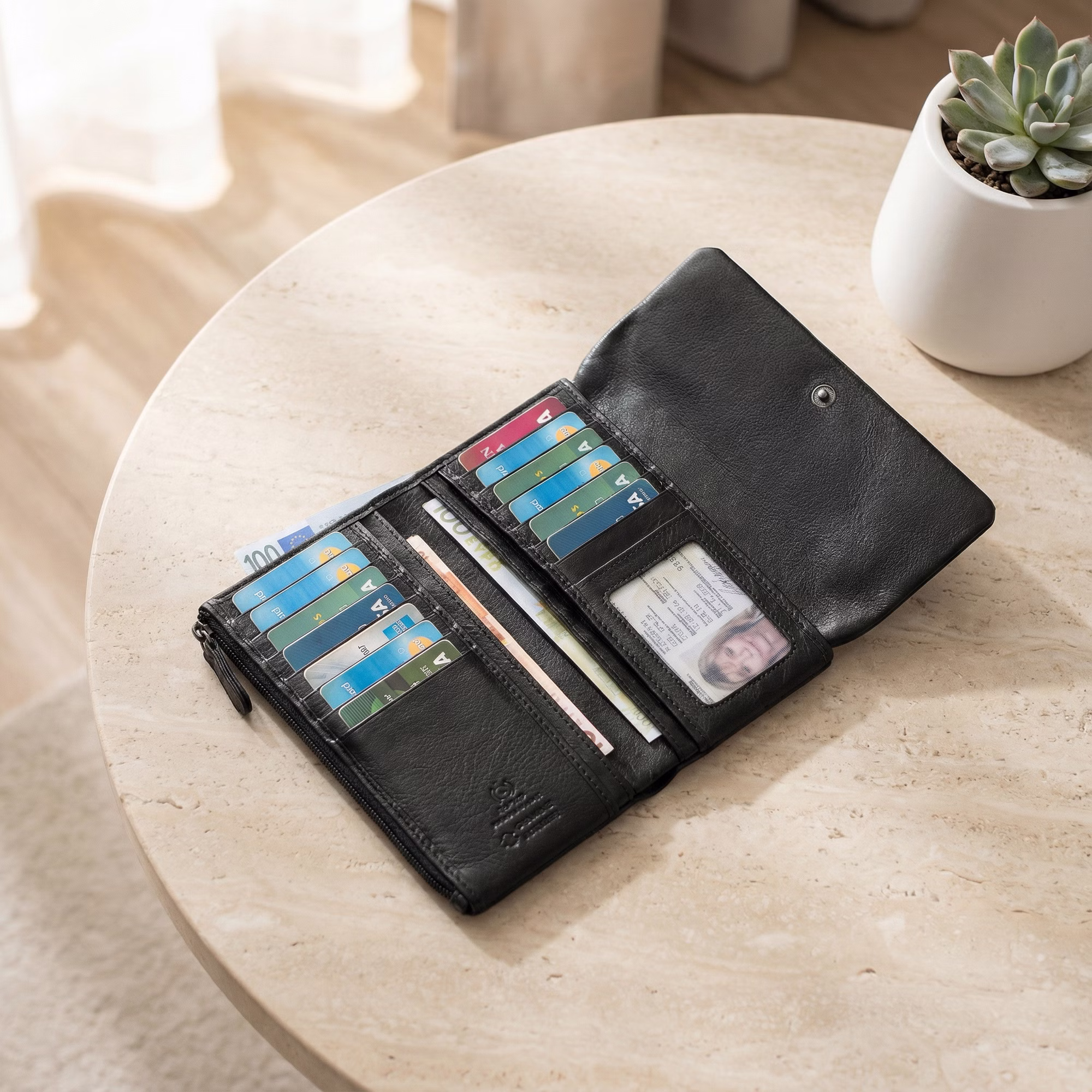 Pour les femmes qui apprécient l’élégance et la clarté : Ce portefeuille femme cuir élégant et rabattable offre beaucoup d’espace pour cartes, billets et reçus. Avec 14 emplacements pour cartes dont une fenêtre filet, quatre poches plates et un compartiment pour billets, tout reste parfaitement organisé et facilement accessible. Facilement rabattable et sécurisé grâce à un bouton-pression de haute qualité – idéal comme portefeuille long femme cuir pour celles qui aiment l’organisation et le design intemporel.