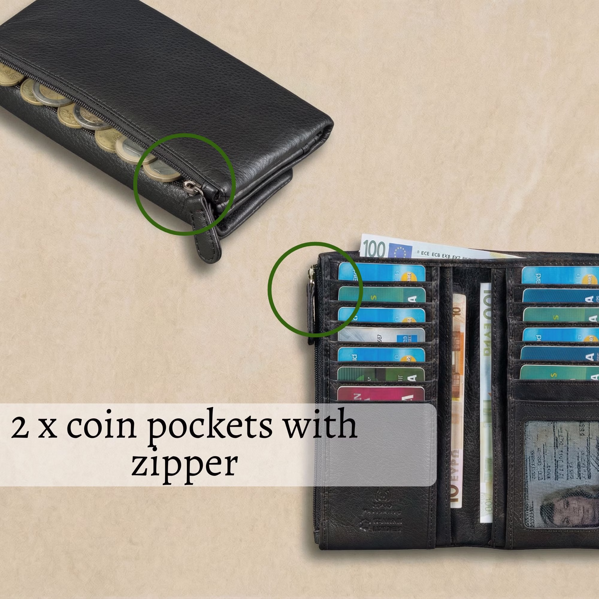 - XL PORTEFEUILLE FEMME CUIR: Ce grand portefeuille femme cuir véritable avec porte-monnaie zippé offre 14 emplacements cartes, 4 poches plates pour reçus, 1 compartiment billets et 2 large porte-monnaie sécurisé avec protection RFID – un portefeuille femme grand format cuir pensé pour votre quotidien.