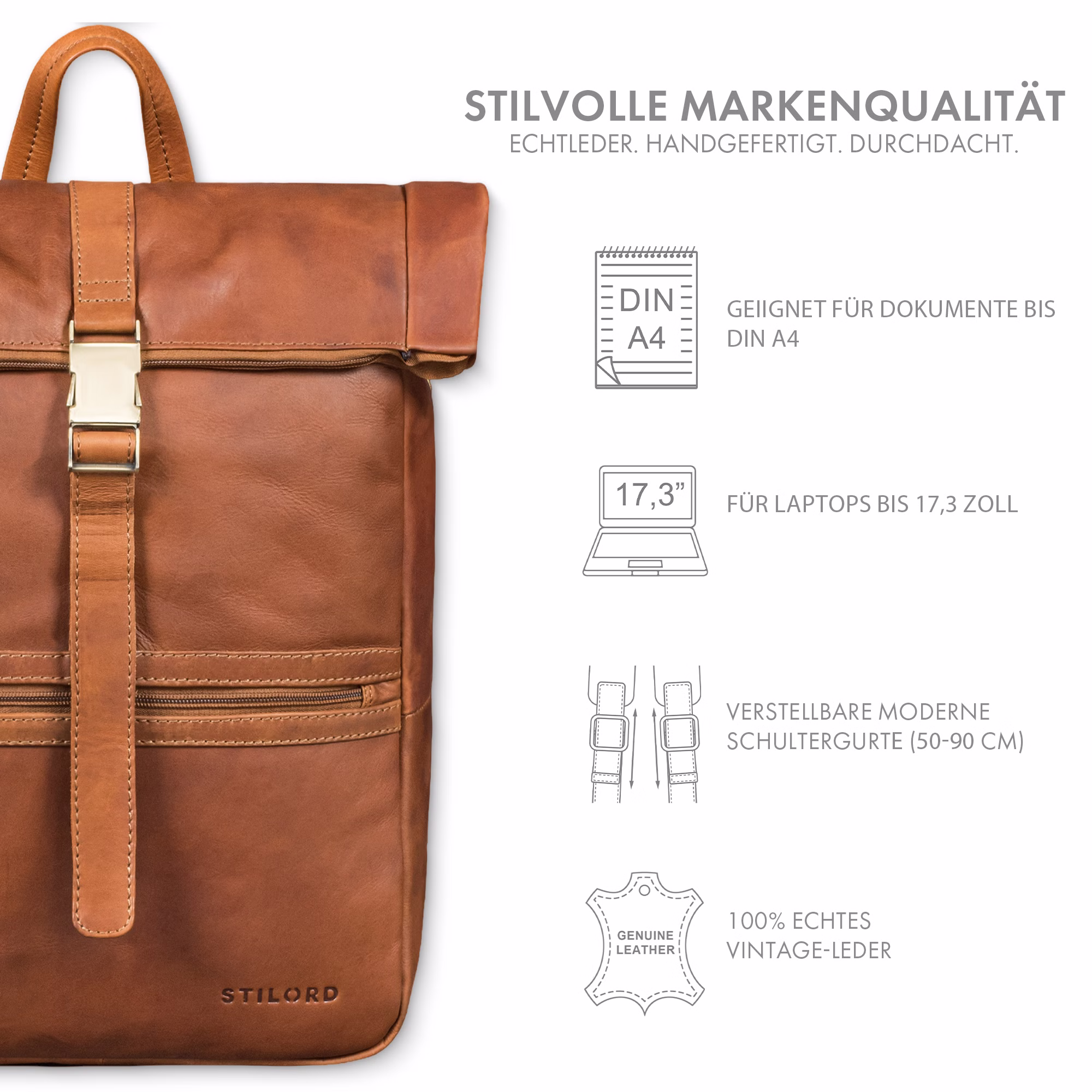 - DÉTAILS SUR LE PRODUIT : Dimensions (LxlxH) : 28 x 12 x 43 cm | Poids: 780 g | Modèle: "Cairo" | Matériau: cuir véritable | Fabricant: STILORD | Compatibilité: Ordinateur portable jusqu'à 17,3 pouces et large classeur DIN A4 dans le compartiment principal | Caractéristiques spéciales : Design roll-top, bretelles réglables et répartition pratique des compartiments.