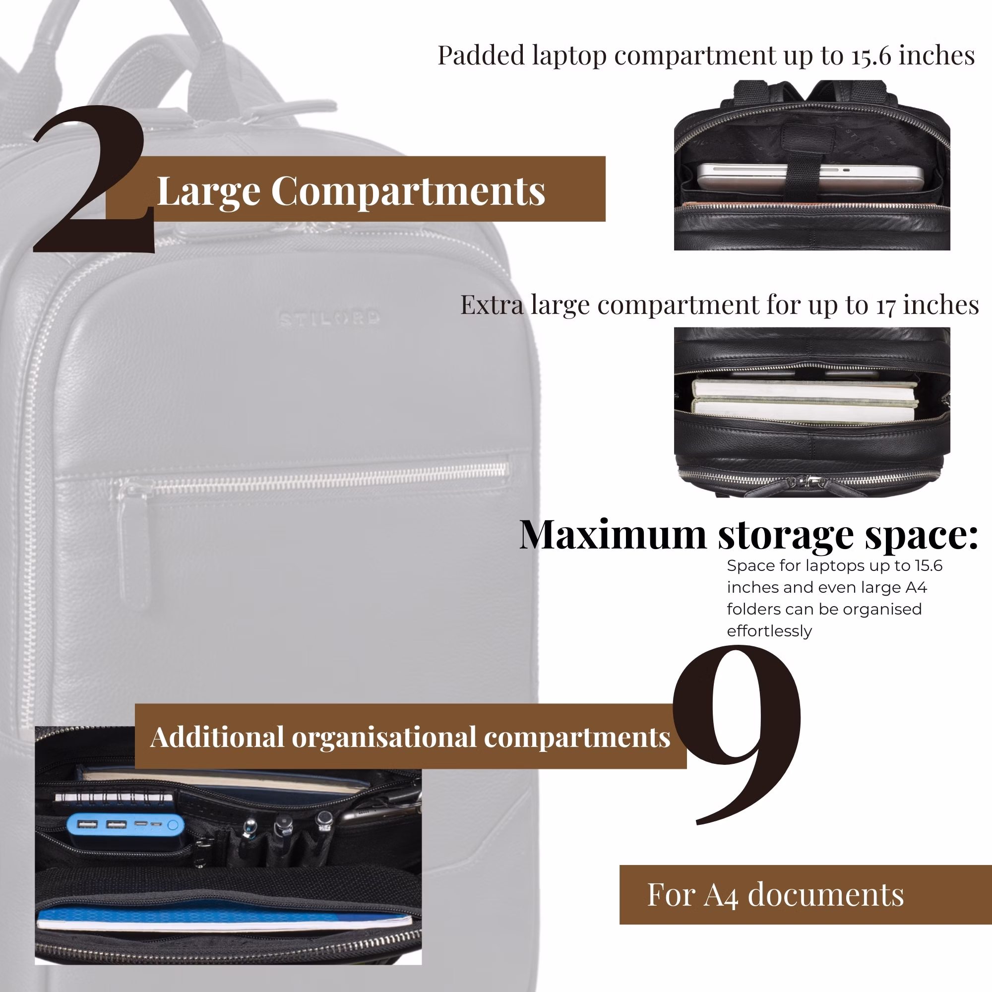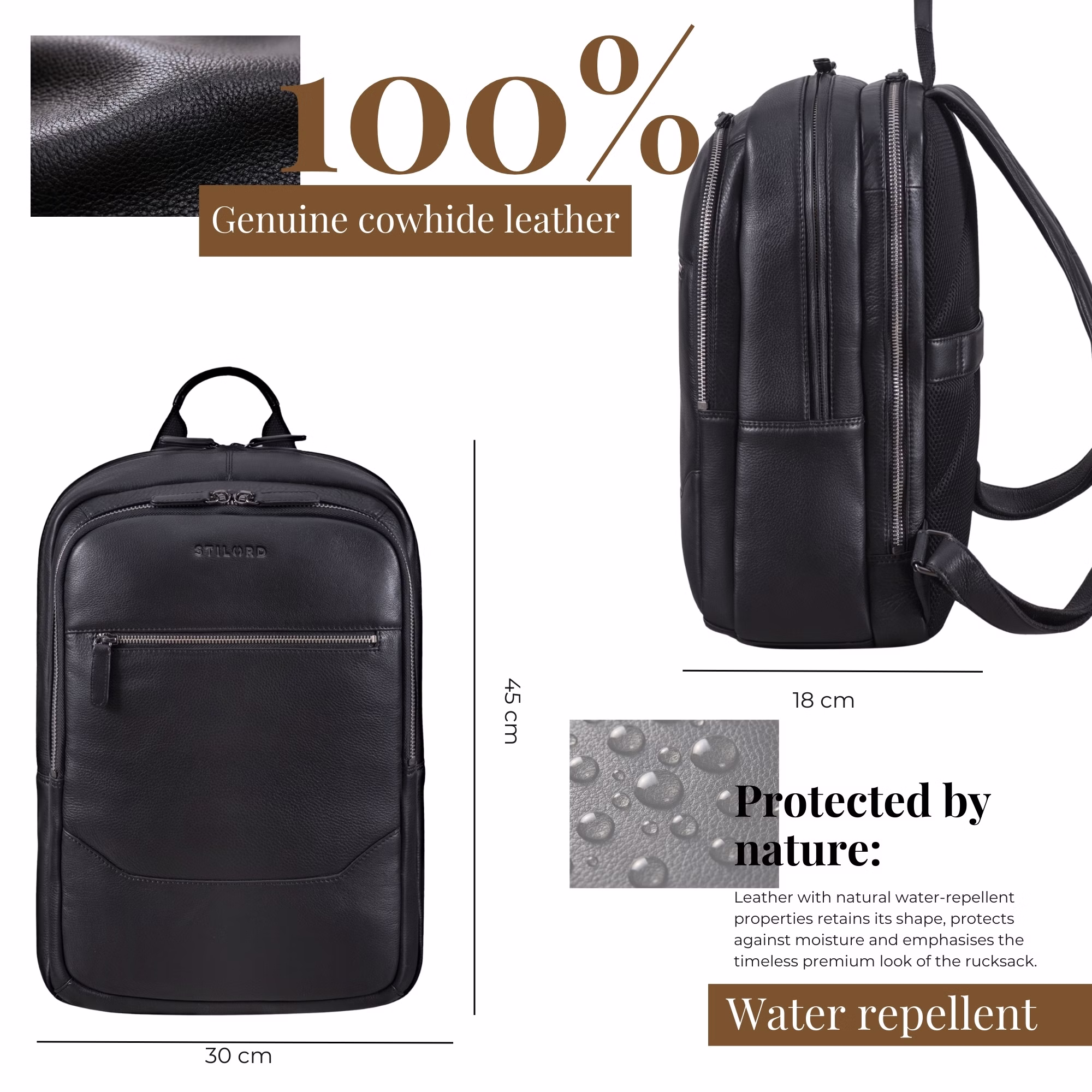 - TOUTES LES INFORMATIONS EN UN COUP D’ŒIL : Dimensions : env. 30 × 18 × 45 cm | Poids : 1100 g | Matière : cuir de vachette véritable | Marque : STILORD | Compartiments pour ordinateur 15,6" (25 × 36 cm) | Compartiment principal non rembourré compatible 17" (27 × 40 cm).
