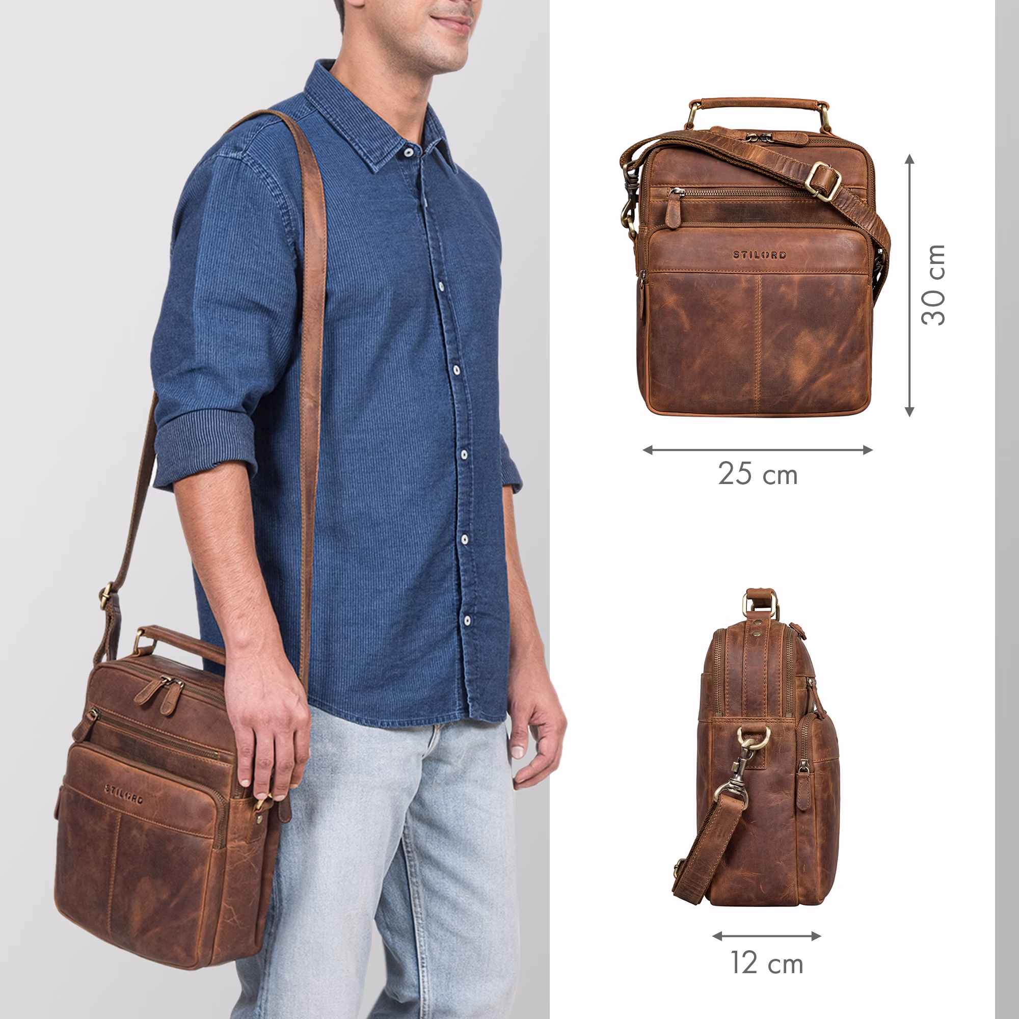 - Dimensions : (LxHxP) env. 25 x 12 x 30 cm | Modèle : Joe | Poids : 1265 g | Matériau : cuir véritable | Type de cuir : cuir de vachette | Fabricant : STILORD | Compatibilité : papiers jusqu'au format DIN A5 | Répartition : 1x grand compartiment principal avec 1x pochette pour smartphones et 1x petit compartiment zippé | 1x compartiment secondaire étroit | 1x compartiment zippé à l'avant | 1x petit compartiment zippé à l'avant avec 4 compartiments pour cartes EC et 2x pochettes | 1x pochette avec bouton-pression à l'arrière | Bandoulière réglable : 85 - 150 cm | Largeur de la sangle : 2,5 cm