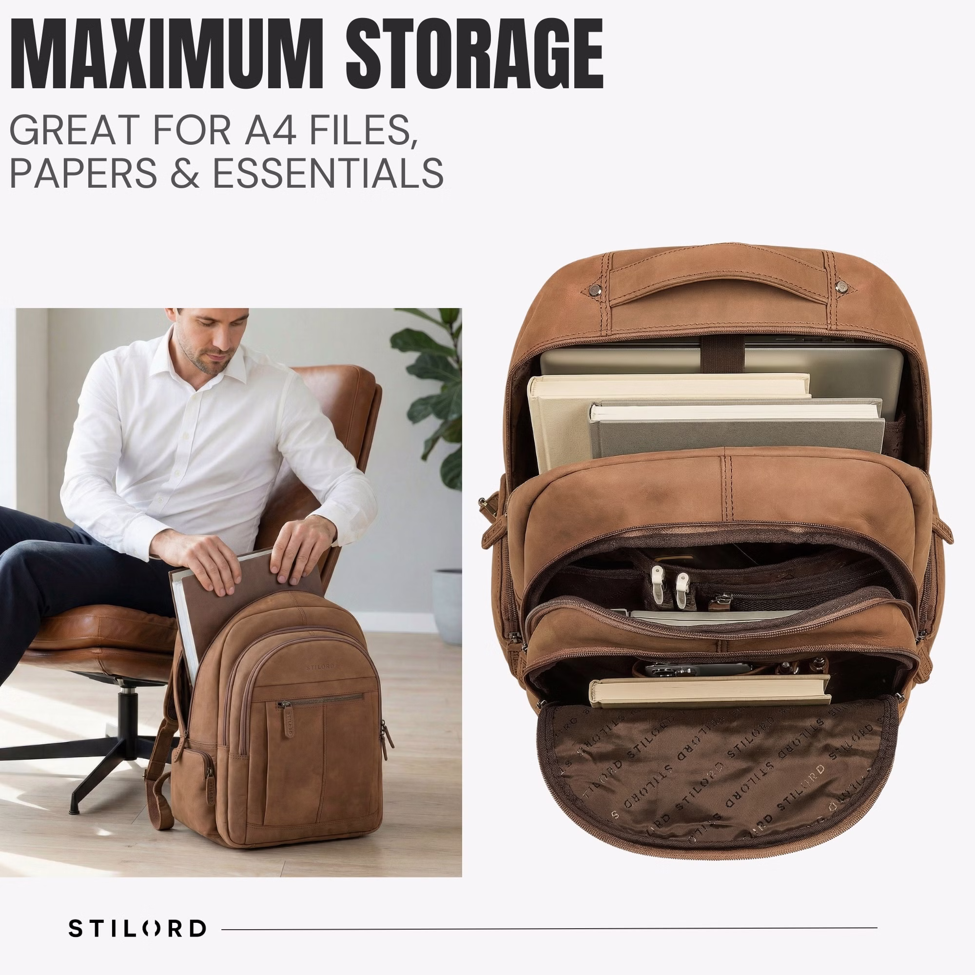 - Second Choix GRAND ESPACE DE RANGEMENT: Ce sac à dos en cuir pour homme offre une capacité généreuse pour les classeurs A4, documents et accessoires. La poche ordinateur rembourrée protège en toute sécurité les laptops jusqu’à 17 pouces.