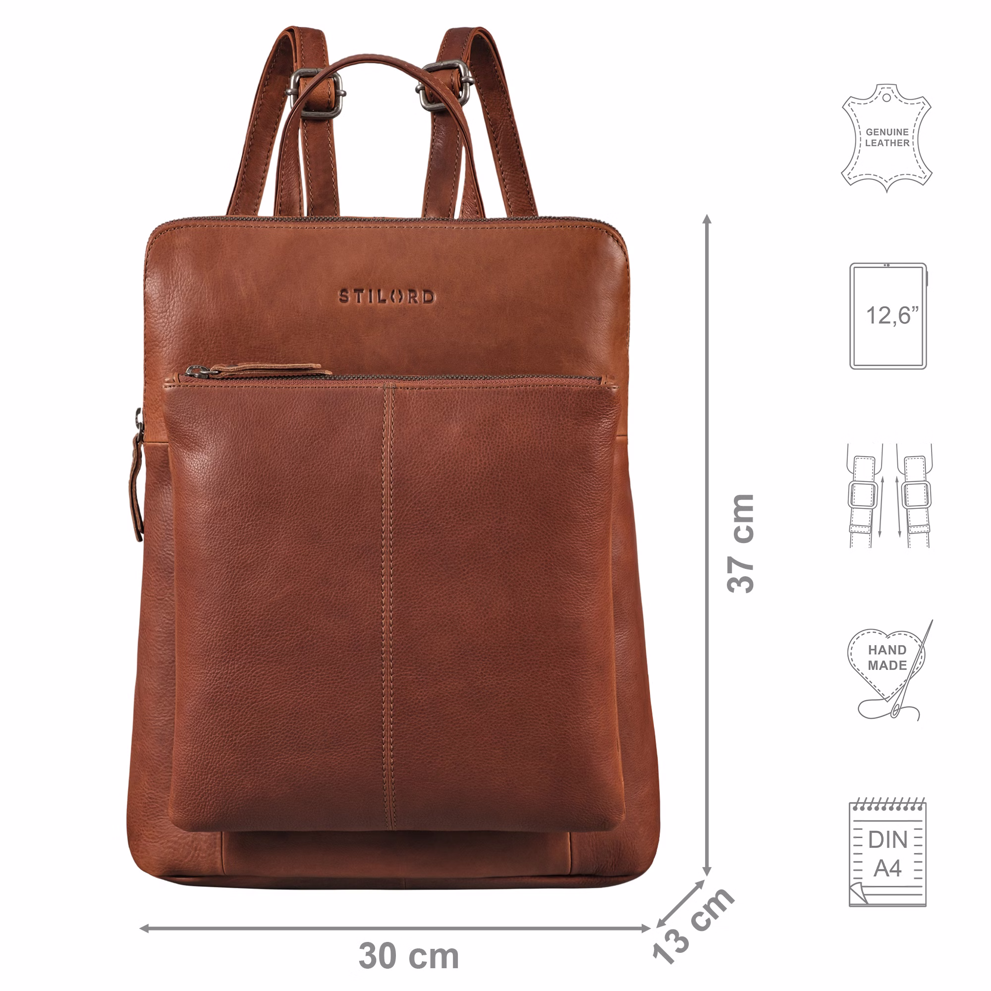 • EN UNE VUE D'ENSEMBLE : Dimensions (LxlxH) : env. 30 x 13 x 37 cm | Modèle : "Jenny | Matériau : cuir véritable | Type de cuir : cuir de vachette | Poids : 696 grammes | Fabricant : STILORD | Espace pour documents DIN A4 dans le compartiment principal