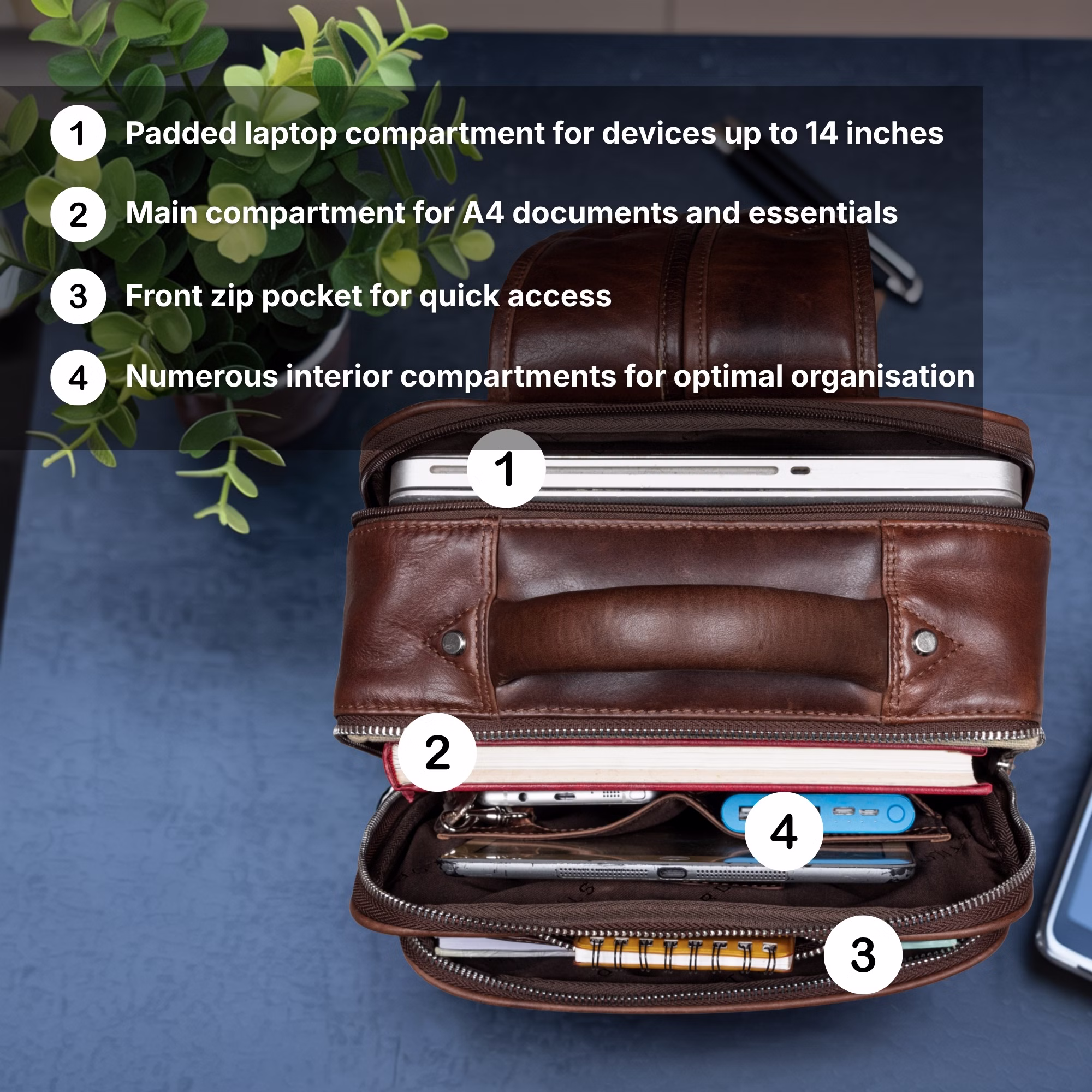 - 1 x compartiment rembourré pour ordinateur portable/Macbook jusqu’à 14 pouces