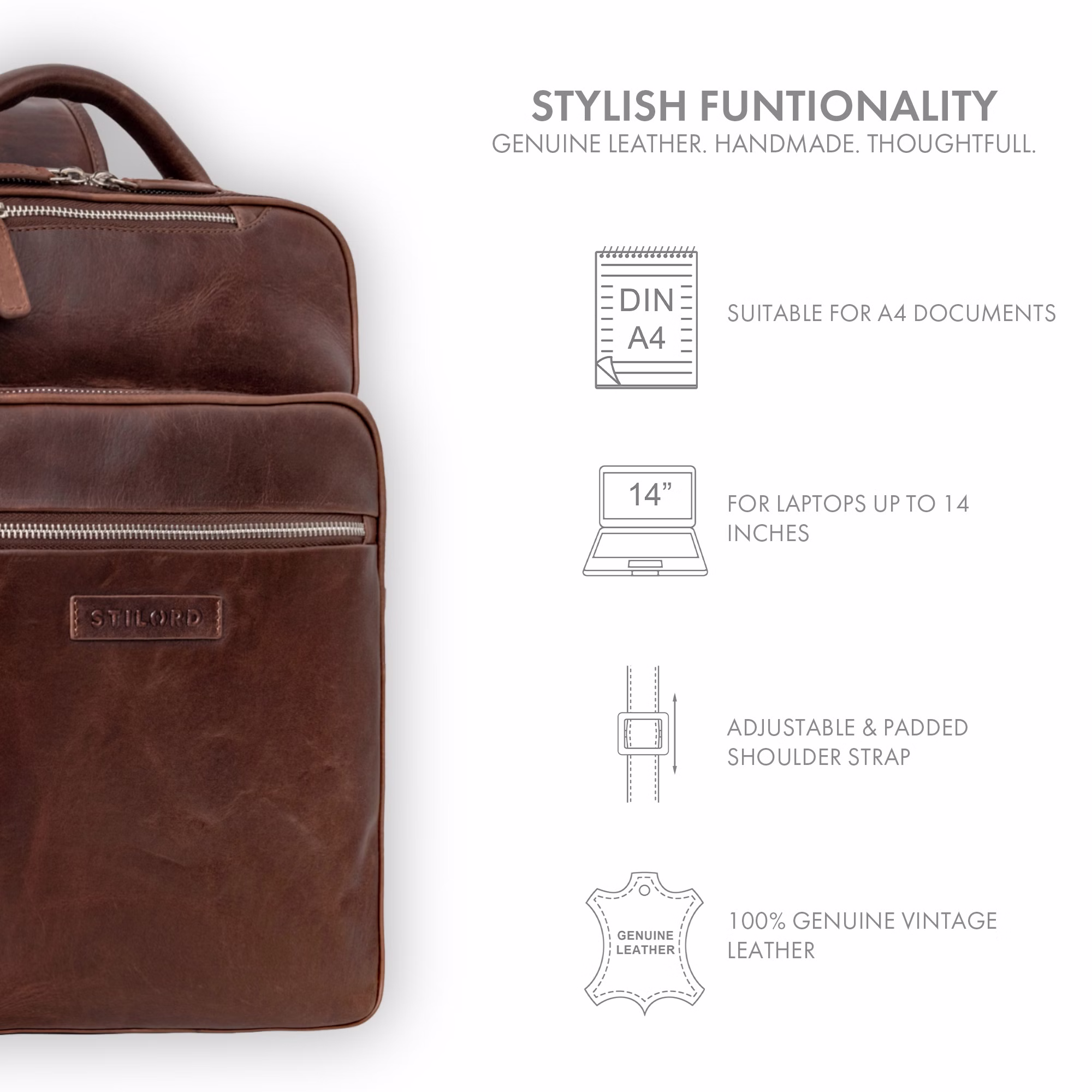 - STILORD – LA MARQUE VINTAGE LIFESTYLE : Service, confiance et qualité sont pour nous des valeurs fondamentales. Nous aimons les sacs à dos vintage modernes en cuir véritable, conçus pour durer et accompagner nos clients toute une vie. Notre passion : rendre le monde plus élégant – chaque jour avec cœur et dévouement.