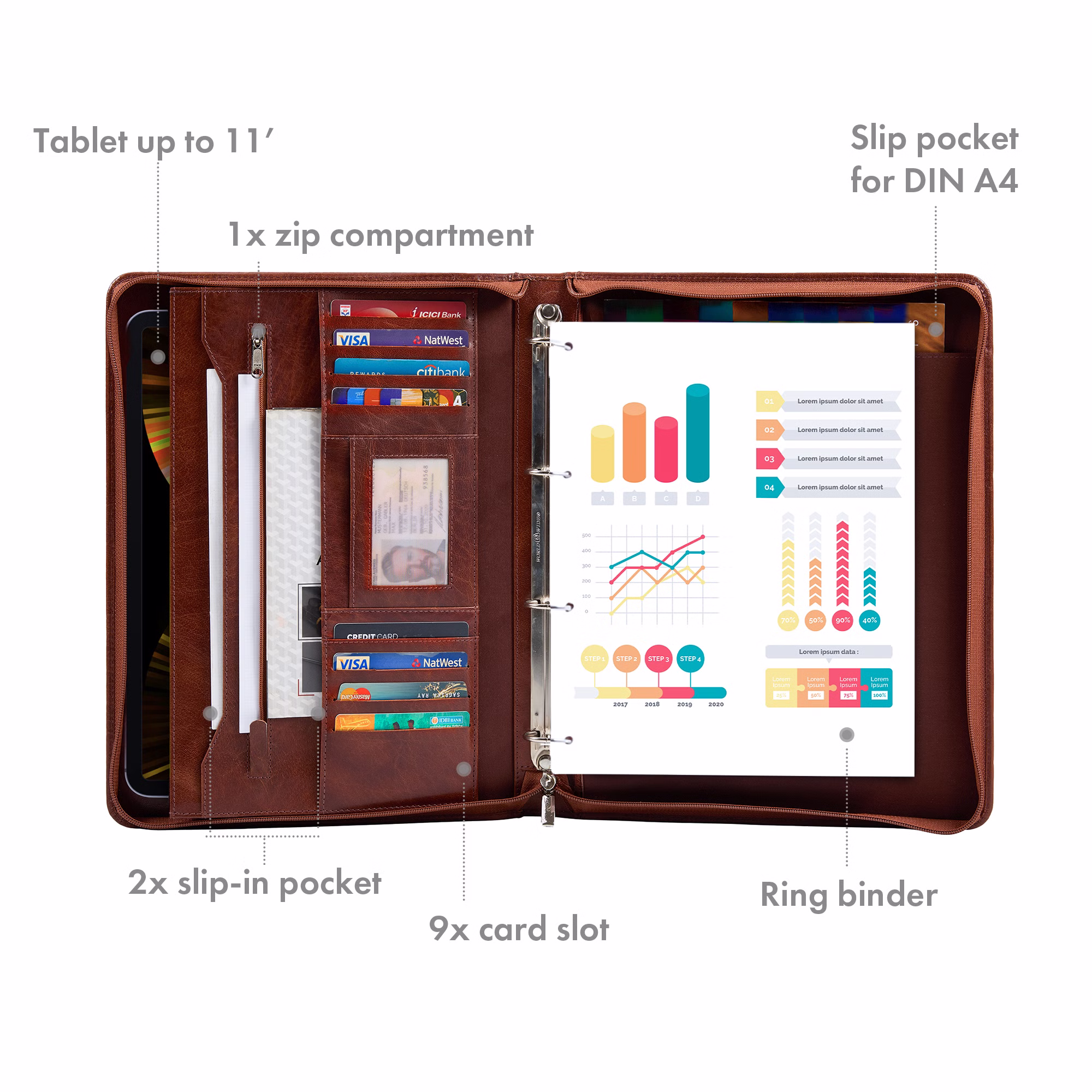 - PRÊT POUR VOS RÉUNIONS : Mécanisme à anneaux, compartiment A4, housse pour tablette (11"), poche zippée, 2 pochettes et 9 emplacements pour cartes – tout ce qu’il faut pour rester organisé et efficace