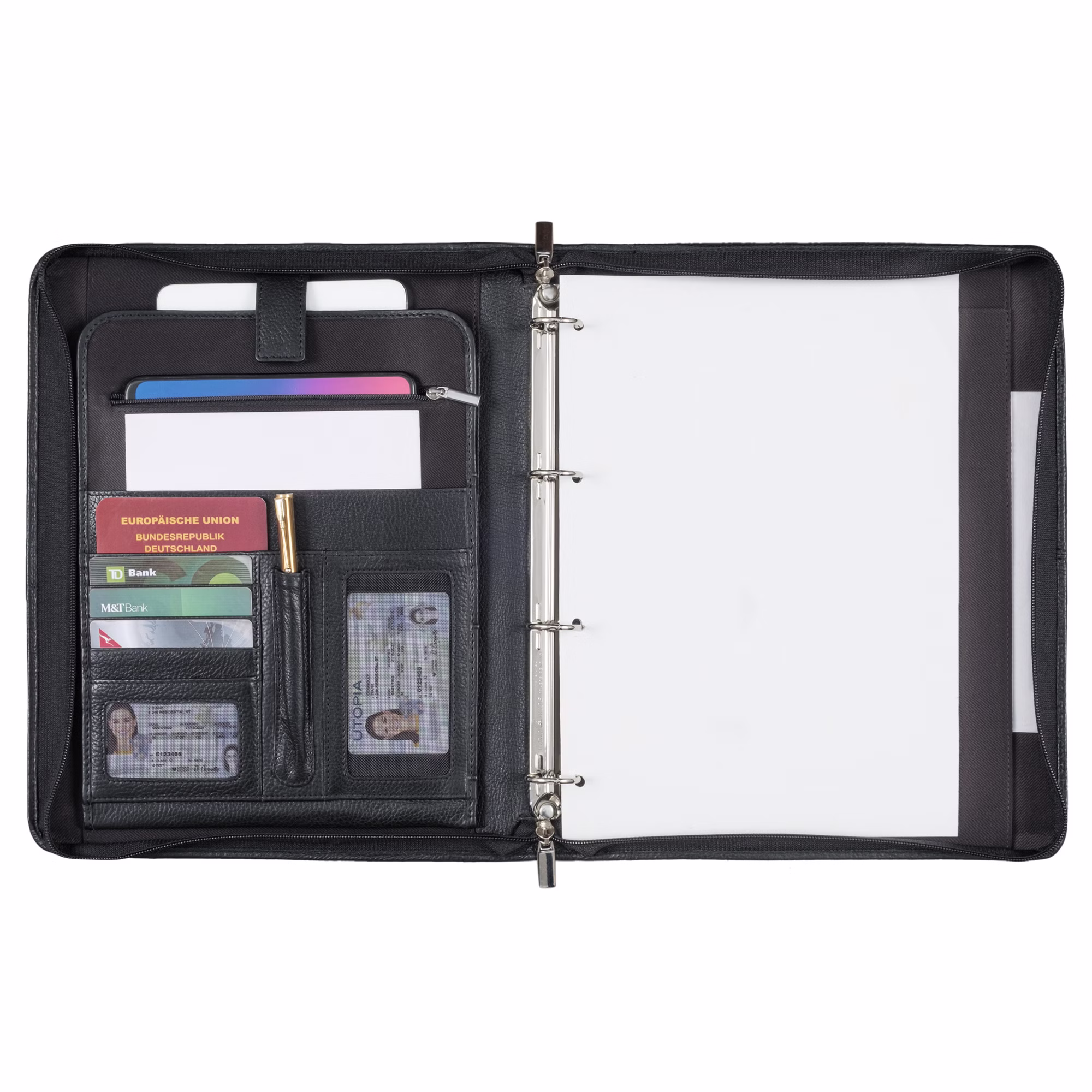 - Distribution: 1x Anneau avec 4 anneaux | 1x Compartiment pour tablette (non rembourré) | 4x Compartiments ouverts | 1x Compartiment à fermeture éclair | 5x Porte-cartes, deux en filet | 1x Porte-stylo