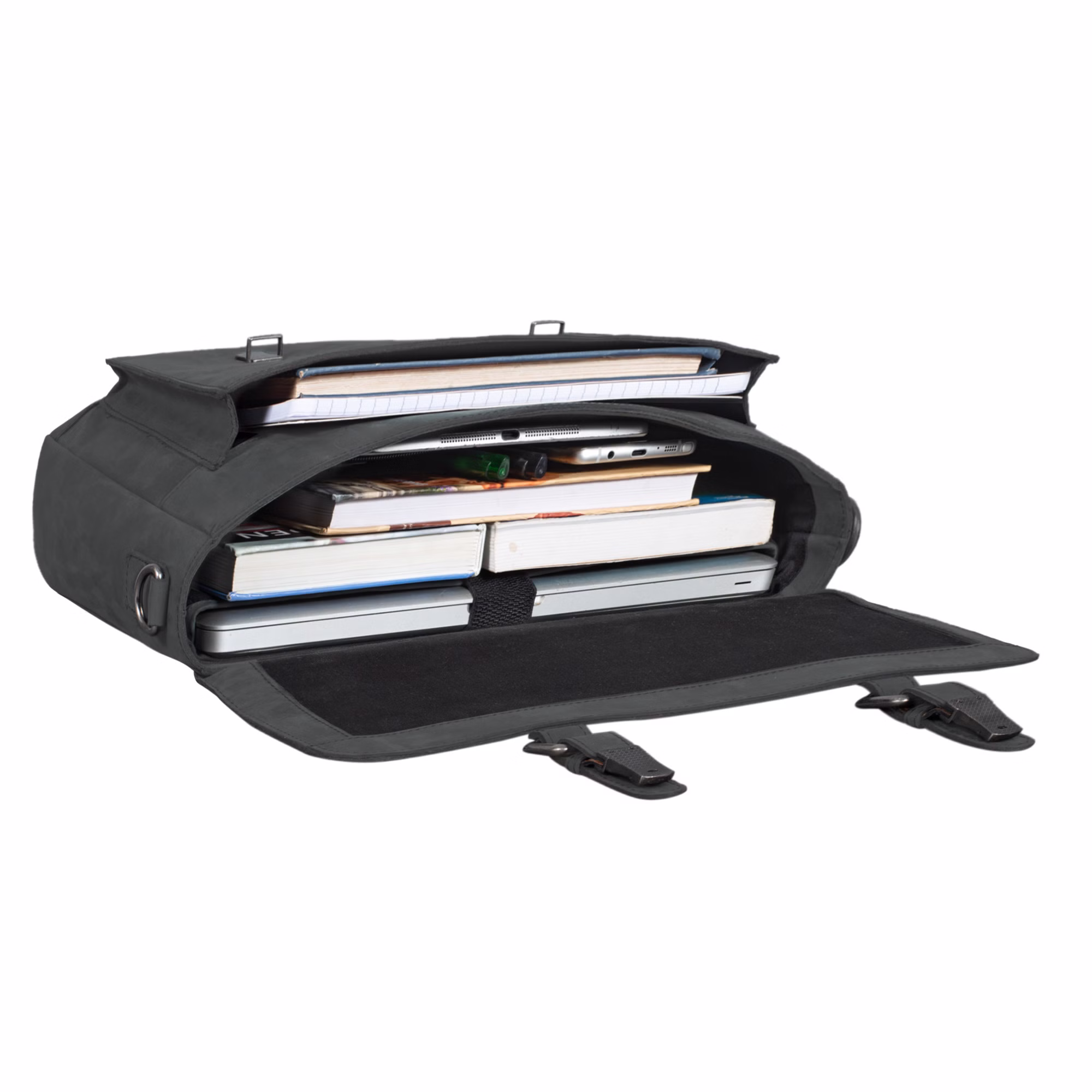 - 1 x grand compartiment principal pour documents DIN A4 | 1 x compartiment rembourré pour ordinateur portable | 1 x bande d'organisation (1 x compartiment zippé, 2 x porte-stylo, 4 x compartiment pour cartes EC, 1 x compartiment à insérer) à l'intérieur | 1 x grand compartiment à insérer sous le volet | 1 x poche zip à l'arrière