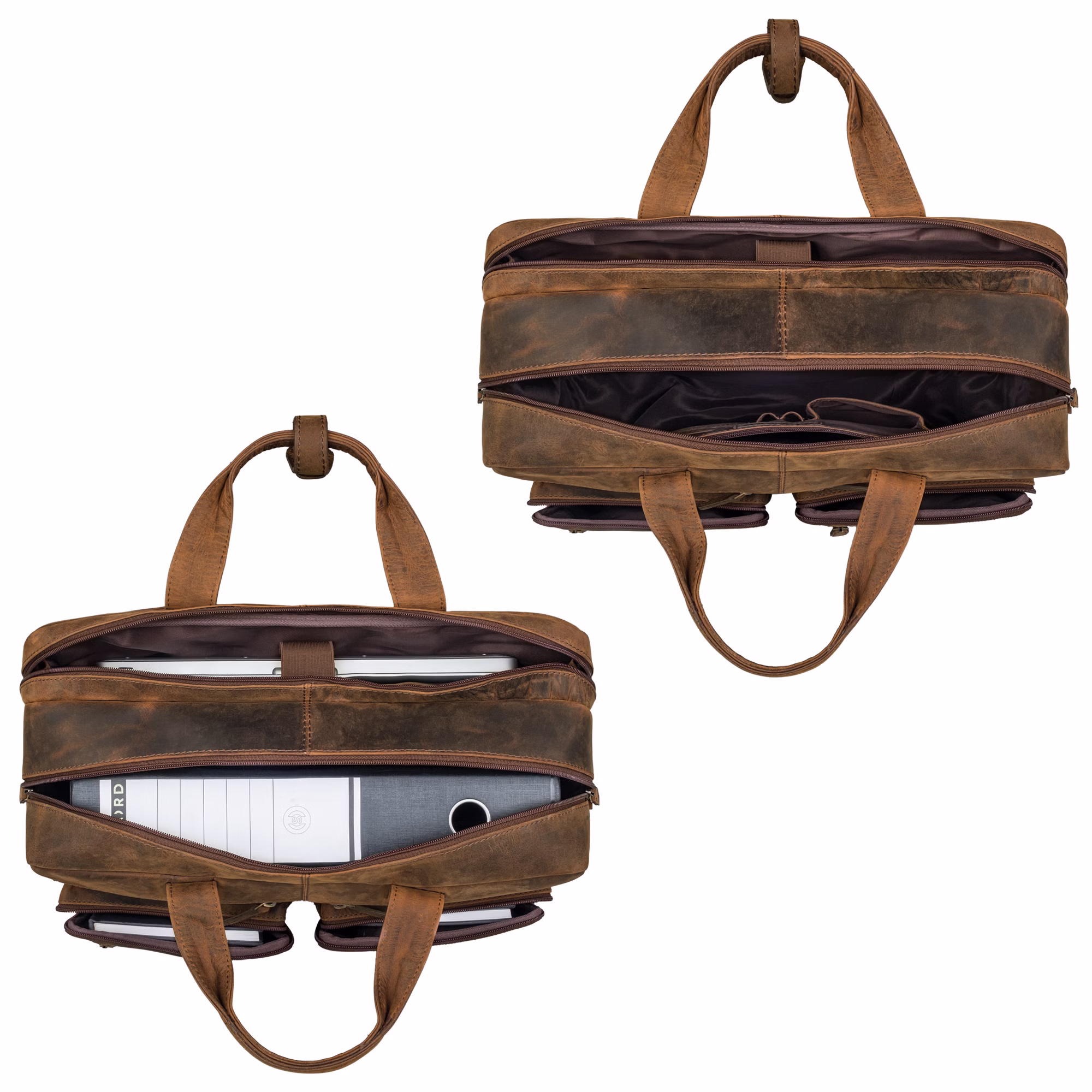 - (LxlxH): env. 42 x 20 x 30 cm | Poids: 1420 grammes | cuir de vachette | Compartiment pour ordinateur portable 15 | 15.3 | 16 | 17 et 17.3 pouces et Macbook (max. 38 x 28 cm), classeurs DIN A4 larges