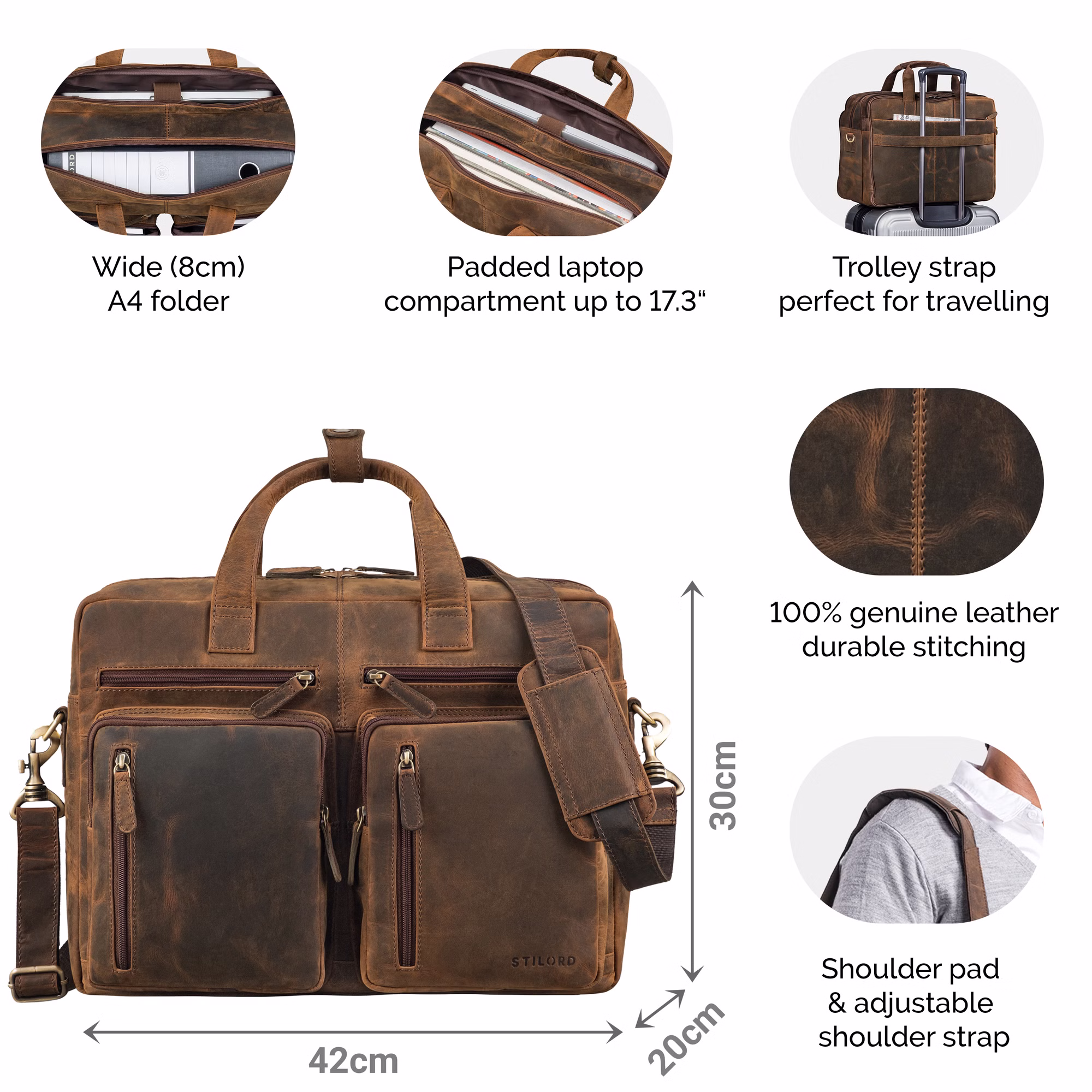 - DÉTAILS: Dimensions: (LxlxH): env. 42 x 20 x 30 cm | Poids: 1420 grammes | Matériau: cuir de vachette | Compatibilité: 1 compartiment rembourré pour ordinateur portable 15 | 15.3 | 16 | 17 et 17.3 pouces et Macbook (max. 38 x 28 cm), large classeur DIN A4