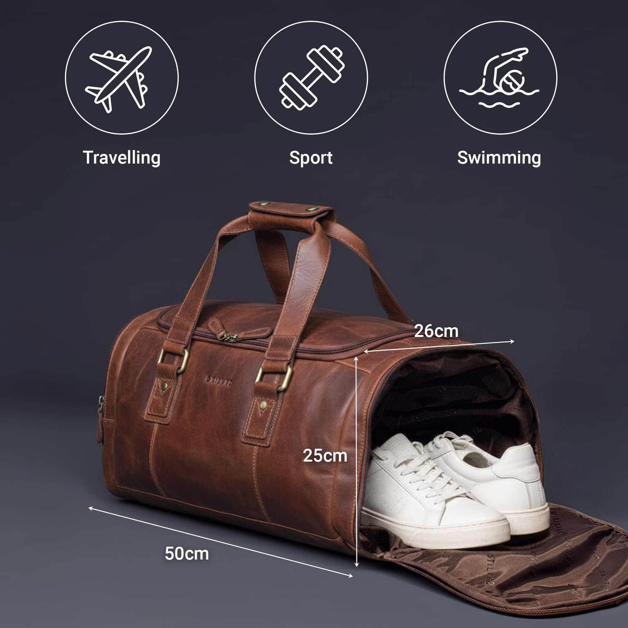 • INTEMPOREL. ROBUSTE. SALVADOR: Le sac de sport compartiment chaussures offre 30 litres, un format pratique 50 x 24 x 25 cm et un cuir vintage au caractère marqué. Pour voyage d’affaires, week-end ou sport, ce grand sac de sport vous accompagne avec style, confort et durabilité.