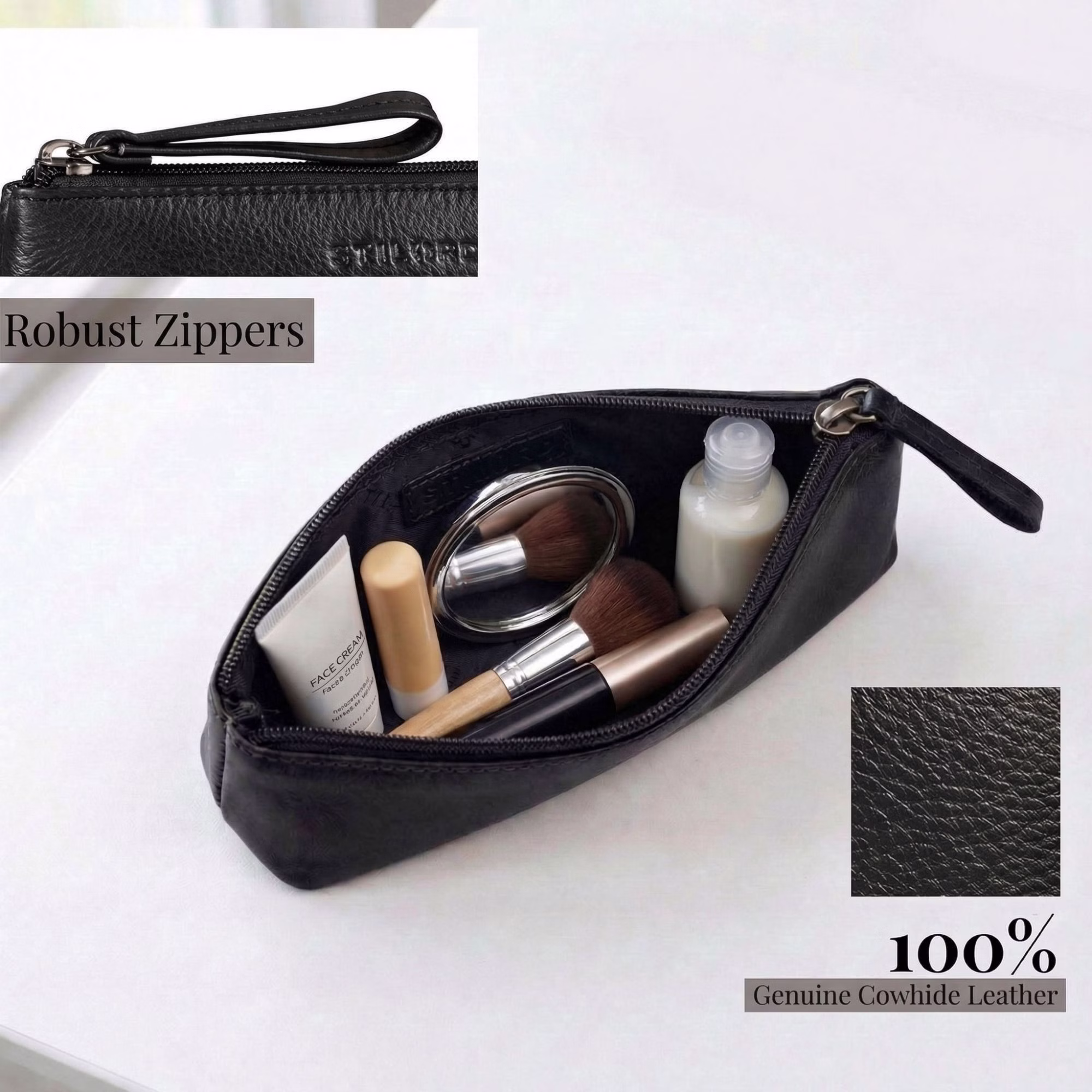 - FERMETURE ÉCLAIR FLUIDE & ROBUSTE : La fermeture éclair à glissement doux permet une ouverture et une fermeture confortables de la trousse cosmétique en cuir – conçue pour un usage quotidien durable